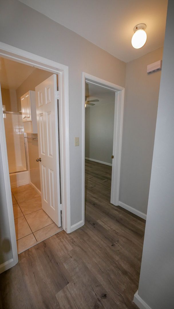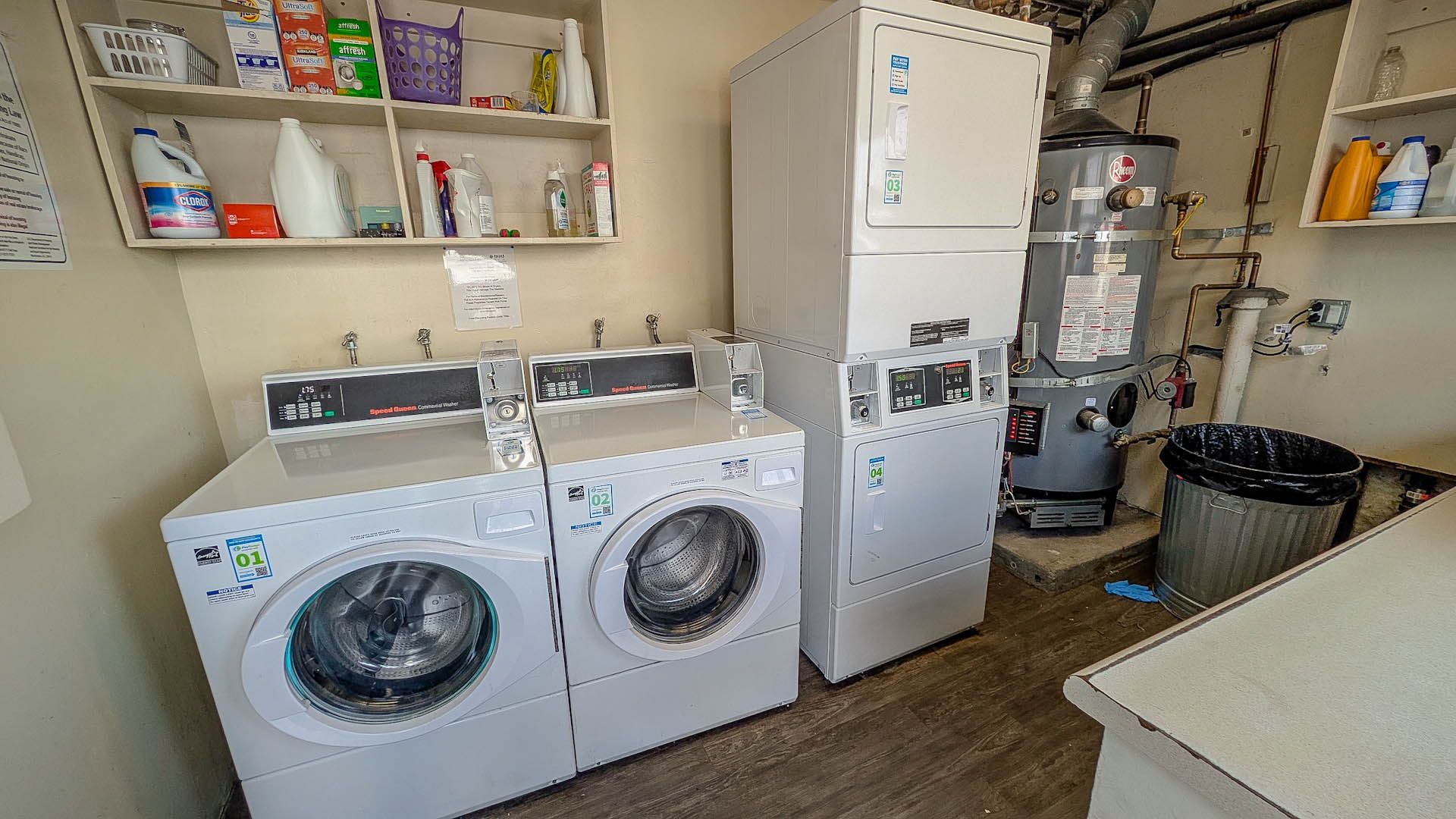 The unit features updated flooring, refreshed paint, and modern baseboards throughout. Residents enjoy onsite laundry facilities and one assigned parking space (#J, located in the rear of the property).