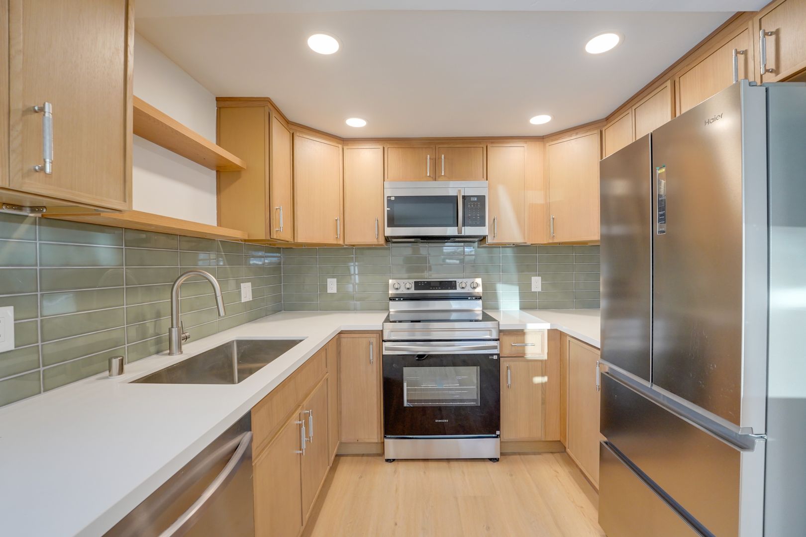 Full kitchen with refrigerator, stove, microwave & dishwasher
